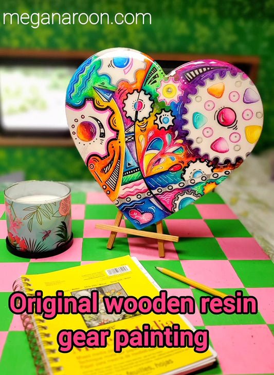 Original Acrylic Wooden Heart Doodle Gears PoP Art Painting #9
