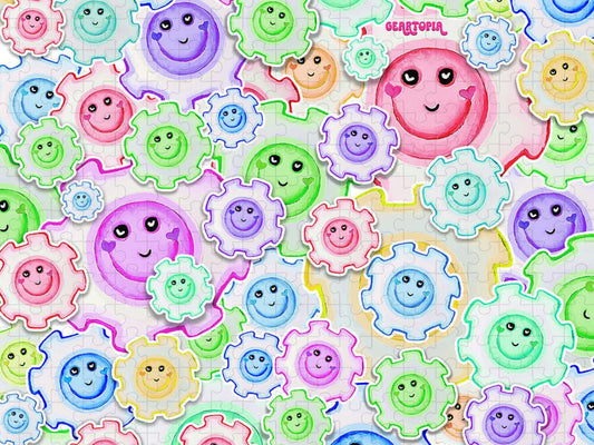 Smiley Face Geartopia Gear Pattern Colorful Pastel Gears II by MeganAroon - Puzzle